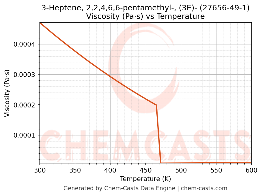 This page presents the temperature-dependent thermodynamic and transport properties of 3-Heptene, 2,2,4,6,6-pentamethyl-, (3E)- (CAS 27656-49-1) calculated at a constant pressure of 1 atm (101325 Pa) over the temperature range 250-500 K.