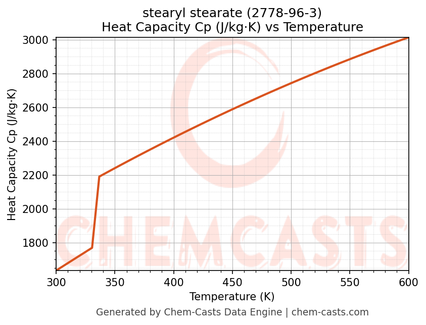- Specific heat capacity (Cp) indicates the amount of energy required to raise the temperature of stearyl stearate and is critical for energy balance and heat-exchanger design.