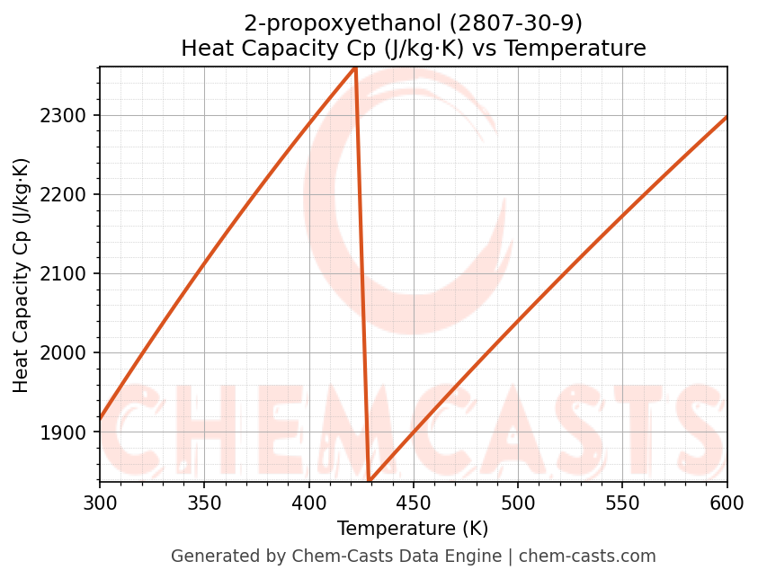 - Specific heat capacity (Cp) indicates the amount of energy required to raise the temperature of 2-propoxyethanol and is critical for energy balance and heat-exchanger design.