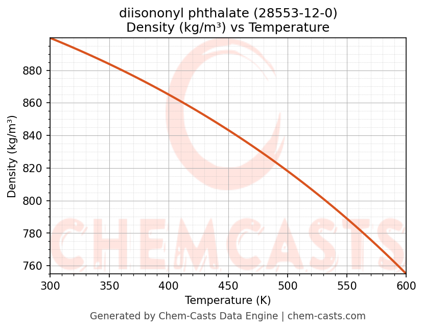 This page presents the temperature-dependent thermodynamic and transport properties of diisononyl phthalate (CAS 28553-12-0) calculated at a constant pressure of 1 atm (101325 Pa) over the temperature range 250-500 K.