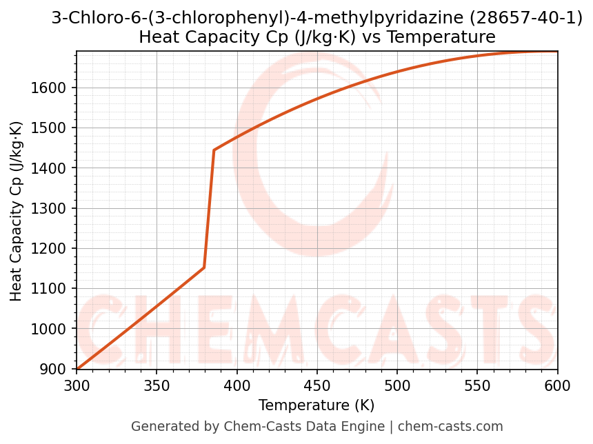 This page presents the temperature-dependent thermodynamic and transport properties of 3-Chloro-6-(3-chlorophenyl)-4-methylpyridazine (CAS 28657-40-1) calculated at a constant pressure of 1 atm (101325 Pa) over the temperature range 250-500 K.