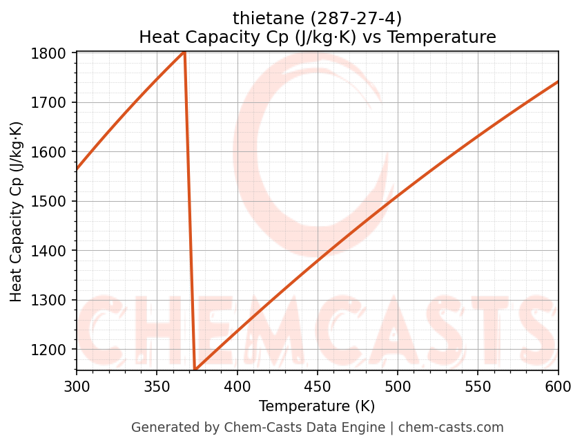 - Specific heat capacity (Cp) indicates the amount of energy required to raise the temperature of thietane and is critical for energy balance and heat-exchanger design.