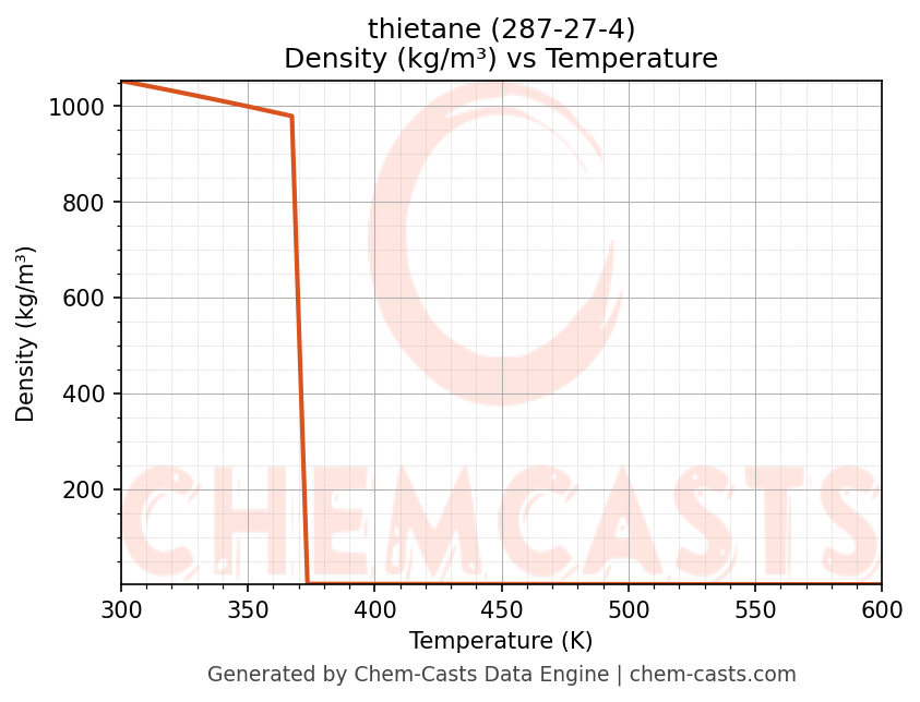 This page presents the temperature-dependent thermodynamic and transport properties of thietane (CAS 287-27-4) calculated at a constant pressure of 1 atm (101325 Pa) over the temperature range 250-500 K.