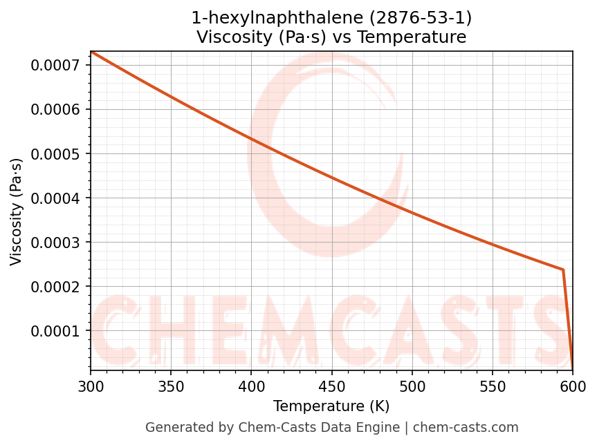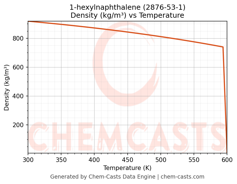 This page presents the temperature-dependent thermodynamic and transport properties of 1-hexylnaphthalene (CAS 2876-53-1) calculated at a constant pressure of 1 atm (101325 Pa) over the temperature range 250-500 K.