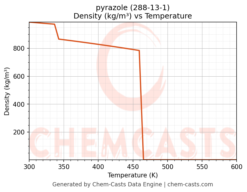 This page presents the temperature-dependent thermodynamic and transport properties of pyrazole (CAS 288-13-1) calculated at a constant pressure of 1 atm (101325 Pa) over the temperature range 250-500 K.