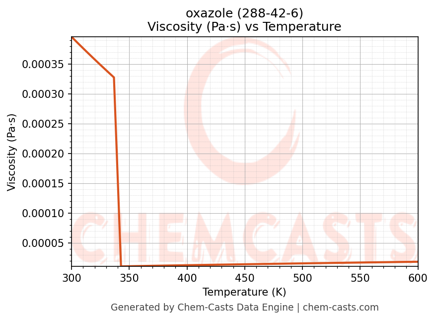 This page presents the temperature-dependent thermodynamic and transport properties of oxazole (CAS 288-42-6) calculated at a constant pressure of 1 atm (101325 Pa) over the temperature range 250-500 K.