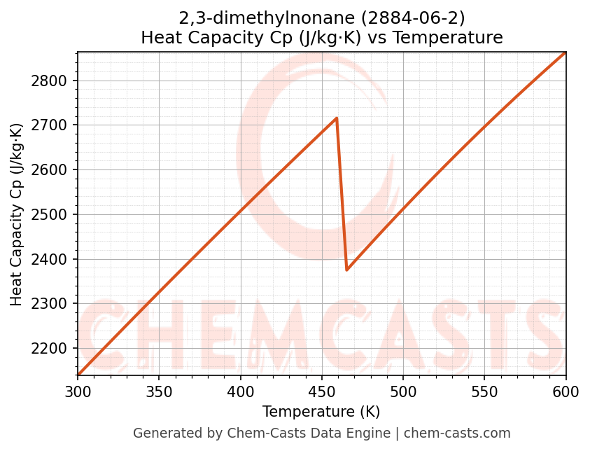 - Specific heat capacity (Cp) indicates the amount of energy required to raise the temperature of 2,3-dimethylnonane and is critical for energy balance and heat-exchanger design.