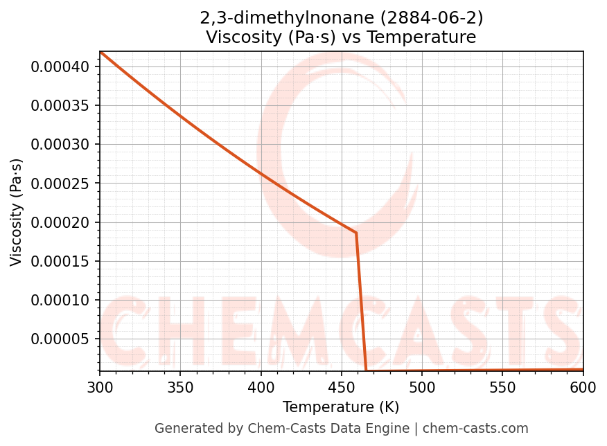 This page presents the temperature-dependent thermodynamic and transport properties of 2,3-dimethylnonane (CAS 2884-06-2) calculated at a constant pressure of 1 atm (101325 Pa) over the temperature range 250-500 K.