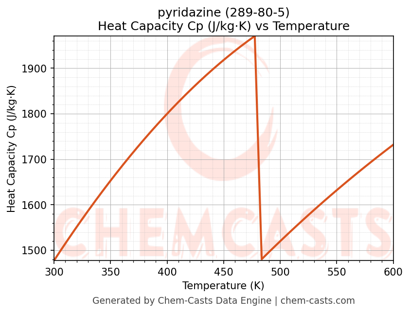 - Specific heat capacity (Cp) indicates the amount of energy required to raise the temperature of pyridazine and is critical for energy balance and heat-exchanger design.