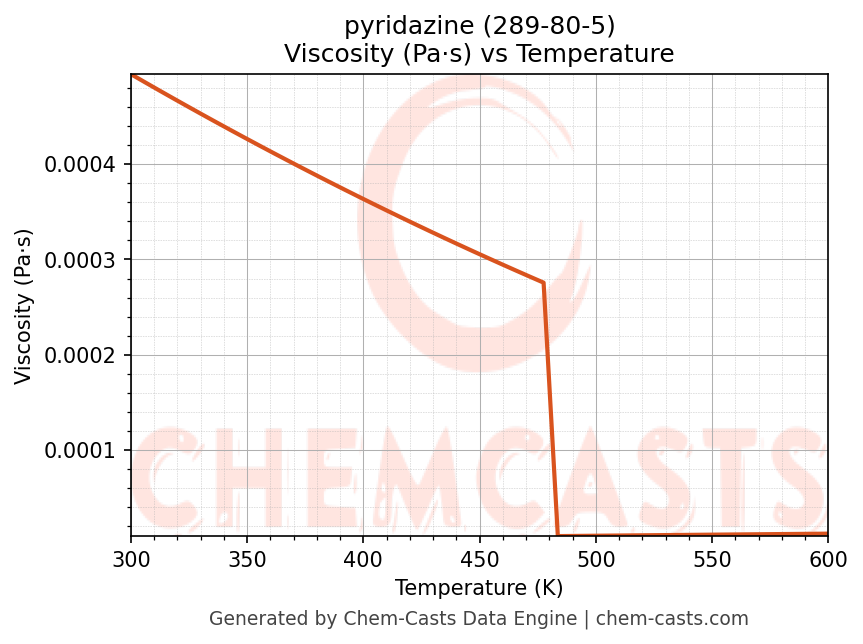 This page presents the temperature-dependent thermodynamic and transport properties of pyridazine (CAS 289-80-5) calculated at a constant pressure of 1 atm (101325 Pa) over the temperature range 250-500 K.