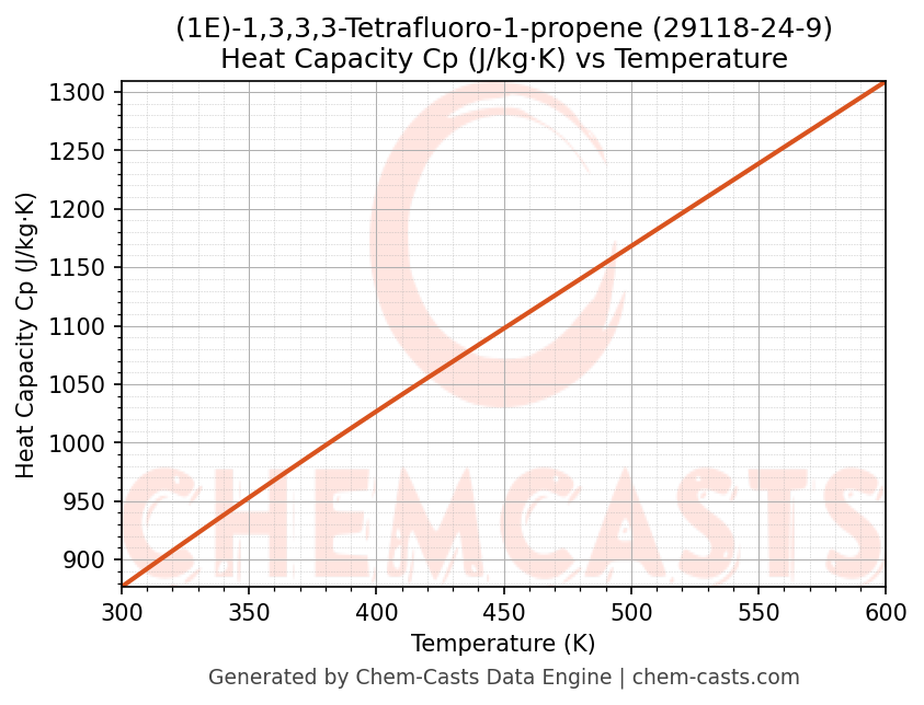 - Specific heat capacity (Cp) indicates the amount of energy required to raise the temperature of (1E)-1,3,3,3-Tetrafluoro-1-propene and is critical for energy balance and heat-exchanger design.