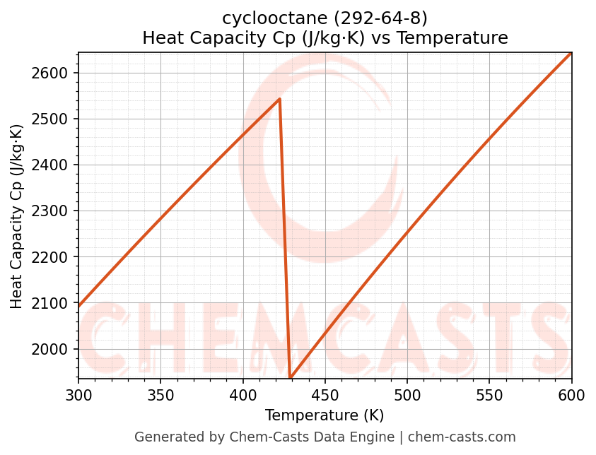 This page presents the temperature-dependent thermodynamic and transport properties of cyclooctane (CAS 292-64-8) calculated at a constant pressure of 1 atm (101325 Pa) over the temperature range 250-500 K.