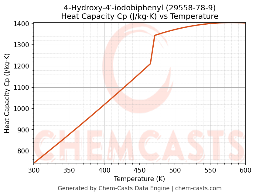 - Specific heat capacity (Cp) indicates the amount of energy required to raise the temperature of 4-Hydroxy-4′-iodobiphenyl and is critical for energy balance and heat-exchanger design.