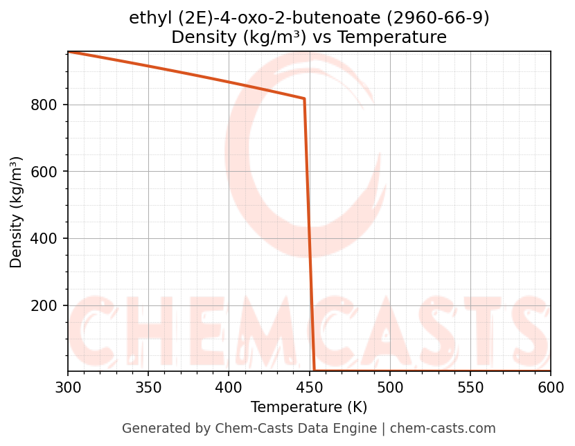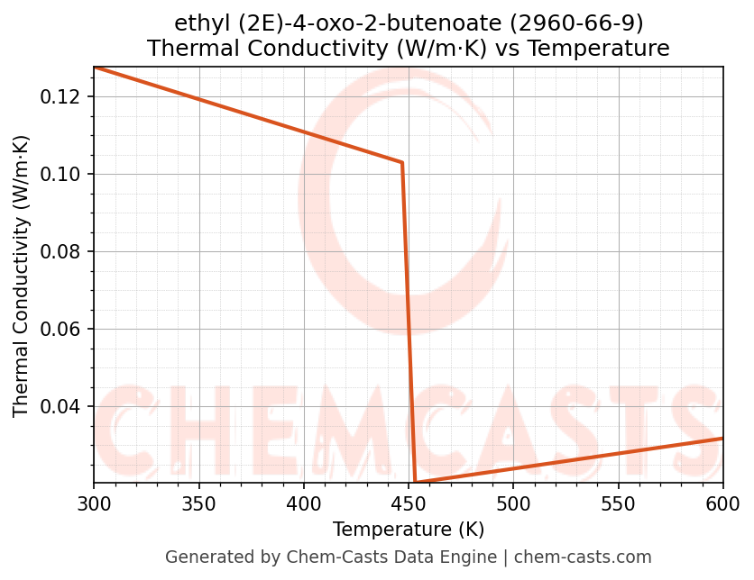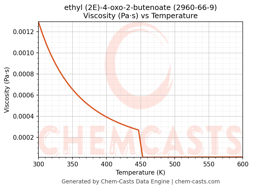 This page presents the temperature-dependent thermodynamic and transport properties of ethyl (2E)-4-oxo-2-butenoate (CAS 2960-66-9) calculated at a constant pressure of 1 atm (101325 Pa) over the temperature range 250-500 K.