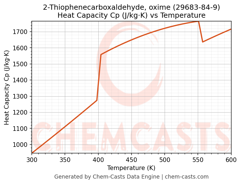 - Specific heat capacity (Cp) indicates the amount of energy required to raise the temperature of 2-Thiophenecarboxaldehyde, oxime and is critical for energy balance and heat-exchanger design.