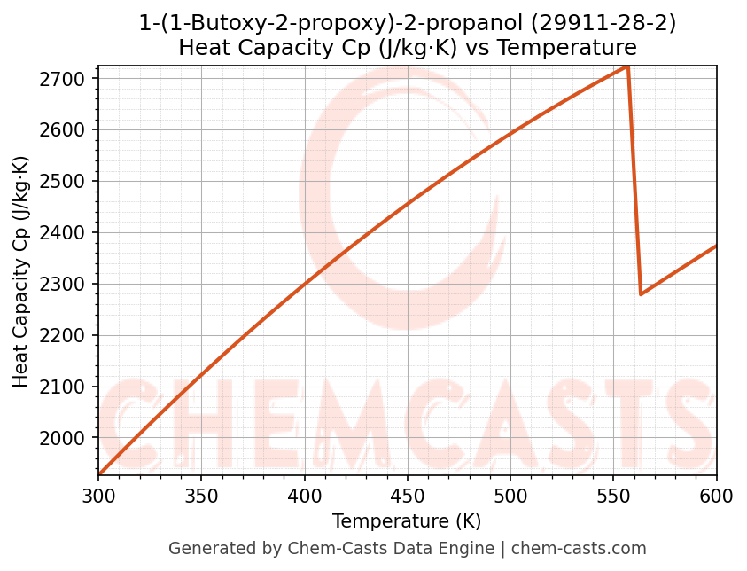 - Specific heat capacity (Cp) indicates the amount of energy required to raise the temperature of 1-(1-Butoxy-2-propoxy)-2-propanol and is critical for energy balance and heat-exchanger design.