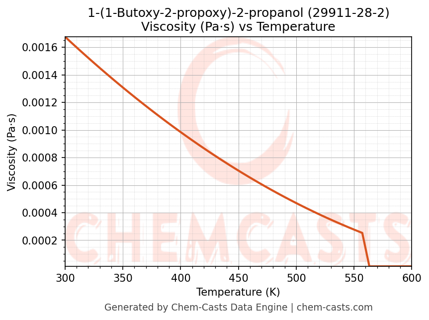 This page presents the temperature-dependent thermodynamic and transport properties of 1-(1-Butoxy-2-propoxy)-2-propanol (CAS 29911-28-2) calculated at a constant pressure of 1 atm (101325 Pa) over the temperature range 250-500 K.