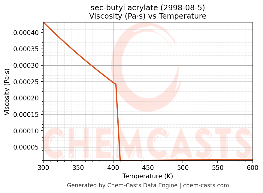This page presents the temperature-dependent thermodynamic and transport properties of sec-butyl acrylate (CAS 2998-08-5) calculated at a constant pressure of 1 atm (101325 Pa) over the temperature range 250-500 K.
