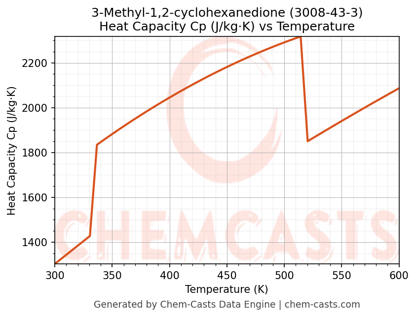 - Specific heat capacity (Cp) indicates the amount of energy required to raise the temperature of 3-Methyl-1,2-cyclohexanedione and is critical for energy balance and heat-exchanger design.