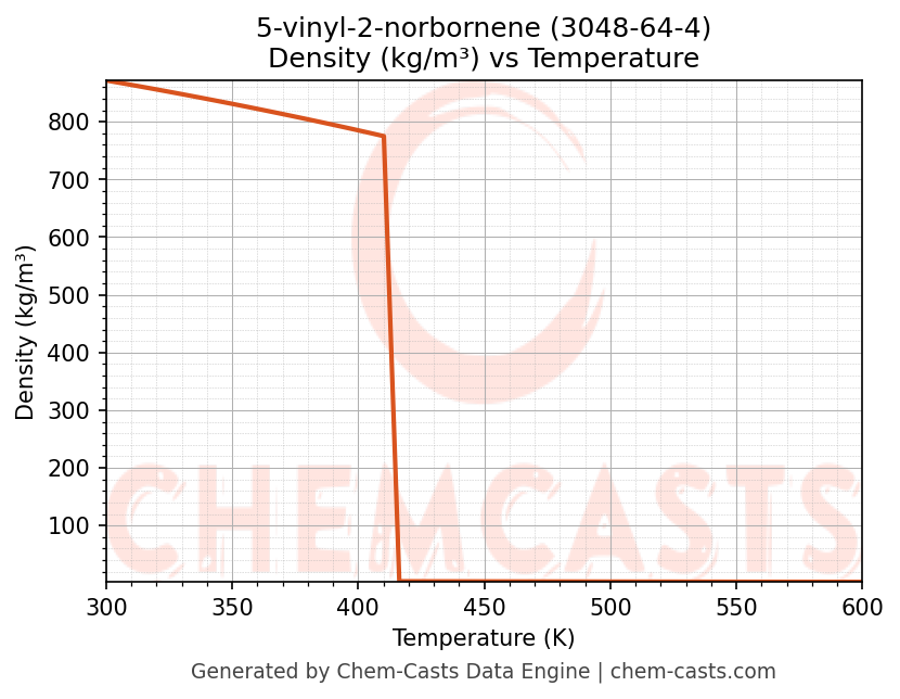This page presents the temperature-dependent thermodynamic and transport properties of 5-vinyl-2-norbornene (CAS 3048-64-4) calculated at a constant pressure of 1 atm (101325 Pa) over the temperature range 250-500 K.