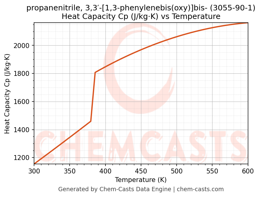 ![Heat Capacity (Cp) vs Temperature chart for propanenitrile, 3,3′-[1,3-phenylenebis(oxy)]bis- (CAS 3055-90-1)](https://chemcasts-prod.s3.ap-south-1.amazonaws.com/chem_plots_pconst/3055-90-1-cp.png)