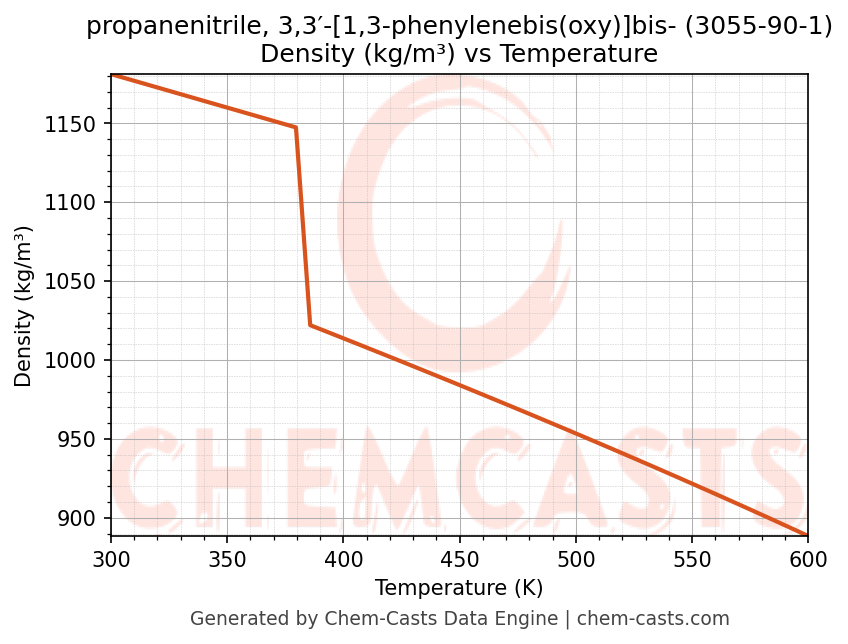![Density vs Temperature chart for propanenitrile, 3,3′-[1,3-phenylenebis(oxy)]bis- (CAS 3055-90-1)](https://chemcasts-prod.s3.ap-south-1.amazonaws.com/chem_plots_pconst/3055-90-1-density.png)