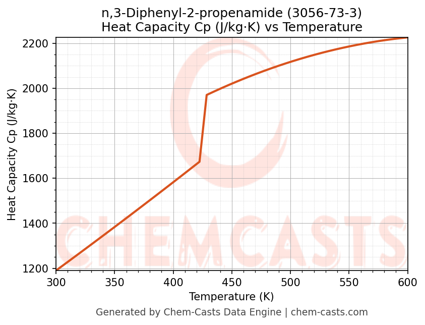 - Specific heat capacity (Cp) indicates the amount of energy required to raise the temperature of n,3-Diphenyl-2-propenamide and is critical for energy balance and heat-exchanger design.