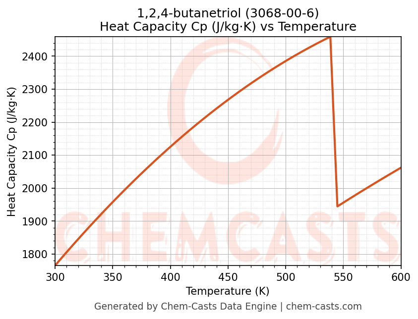 - Specific heat capacity (Cp) indicates the amount of energy required to raise the temperature of 1,2,4-butanetriol and is critical for energy balance and heat-exchanger design.