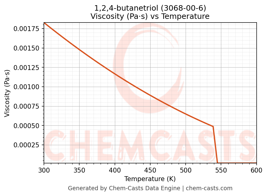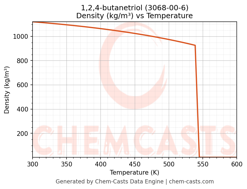 This page presents the temperature-dependent thermodynamic and transport properties of 1,2,4-butanetriol (CAS 3068-00-6) calculated at a constant pressure of 1 atm (101325 Pa) over the temperature range 250-500 K.