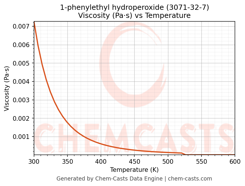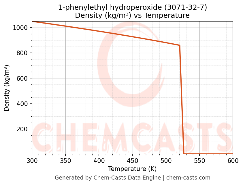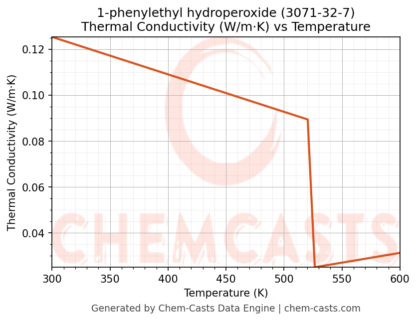 - Specific heat capacity (Cp) indicates the amount of energy required to raise the temperature of 1-phenylethyl hydroperoxide and is critical for energy balance and heat-exchanger design.