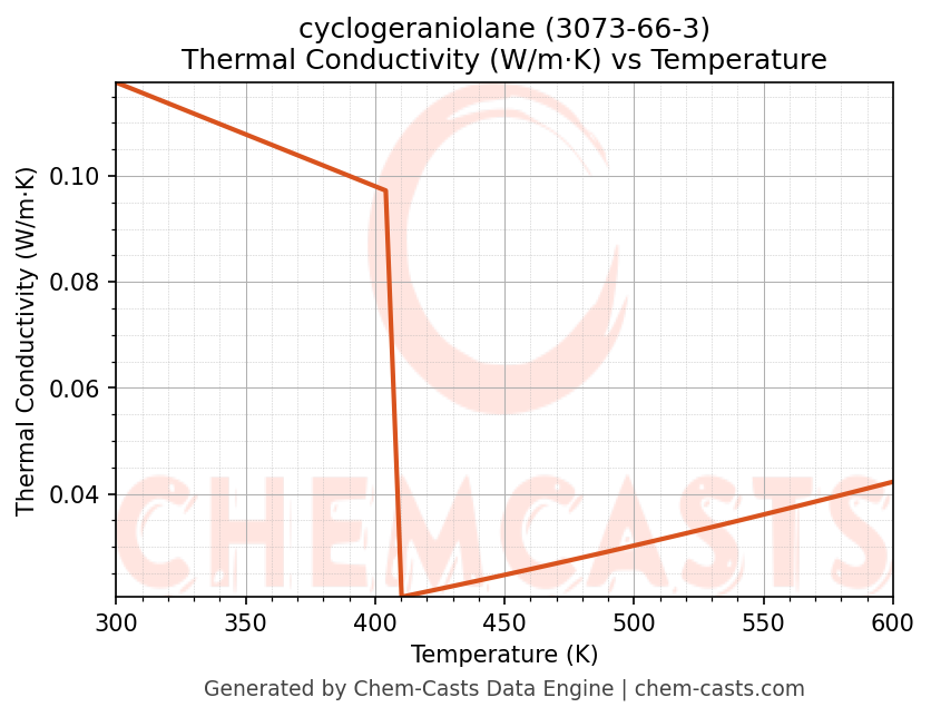 This page presents the temperature-dependent thermodynamic and transport properties of cyclogeraniolane (CAS 3073-66-3) calculated at a constant pressure of 1 atm (101325 Pa) over the temperature range 250-500 K.