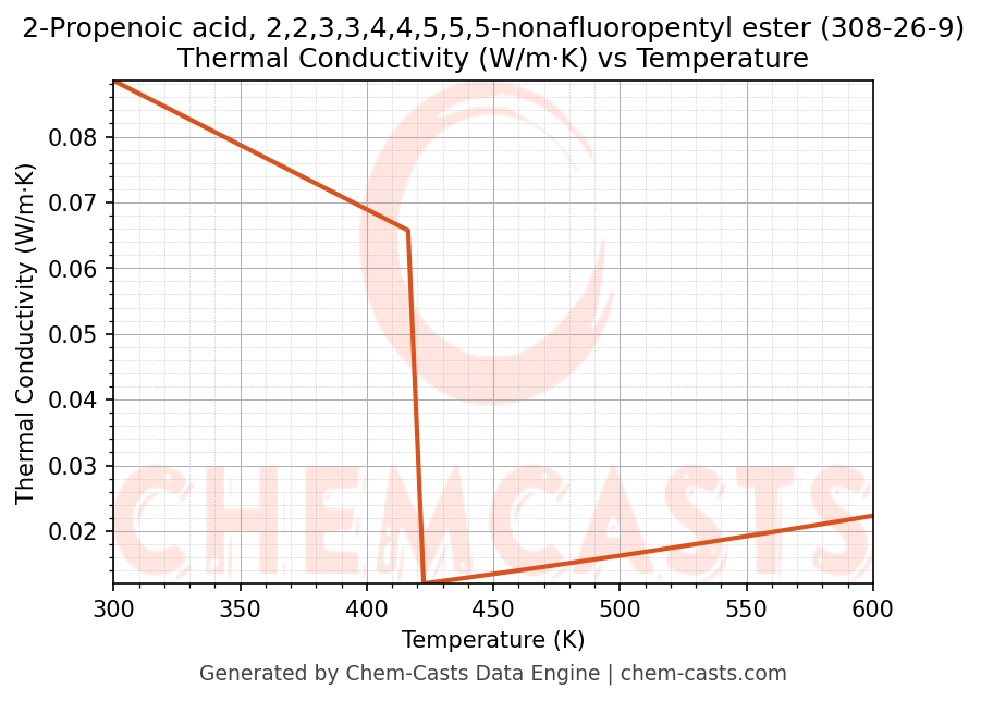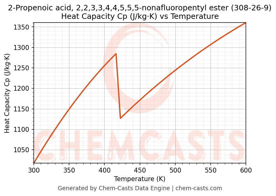 - Specific heat capacity (Cp) indicates the amount of energy required to raise the temperature of 2-Propenoic acid, 2,2,3,3,4,4,5,5,5-nonafluoropentyl ester and is critical for energy balance and heat-exchanger design.