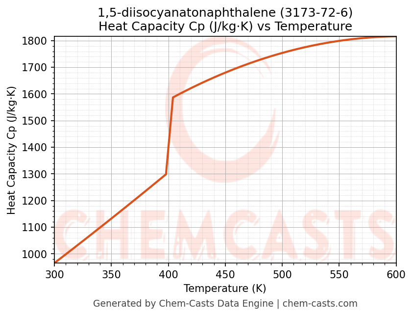 - Specific heat capacity (Cp) indicates the amount of energy required to raise the temperature of 1,5-diisocyanatonaphthalene and is critical for energy balance and heat-exchanger design.