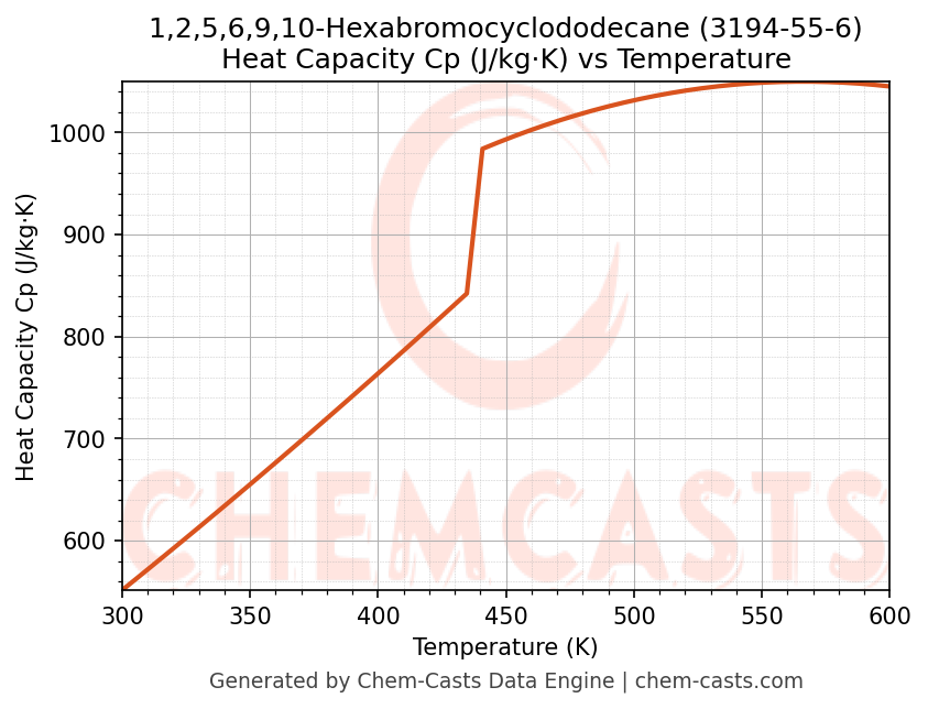 - Specific heat capacity (Cp) indicates the amount of energy required to raise the temperature of 1,2,5,6,9,10-Hexabromocyclododecane and is critical for energy balance and heat-exchanger design.