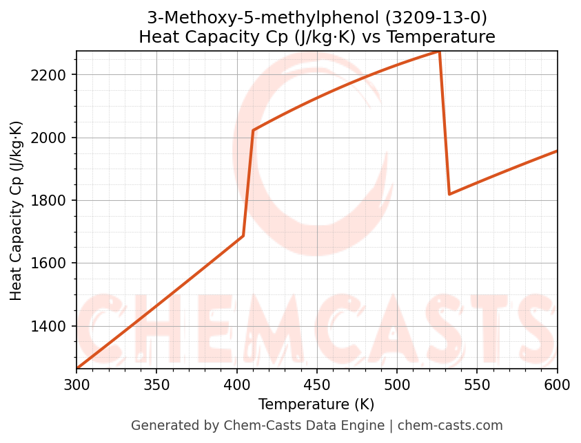 - Specific heat capacity (Cp) indicates the amount of energy required to raise the temperature of 3-Methoxy-5-methylphenol and is critical for energy balance and heat-exchanger design.