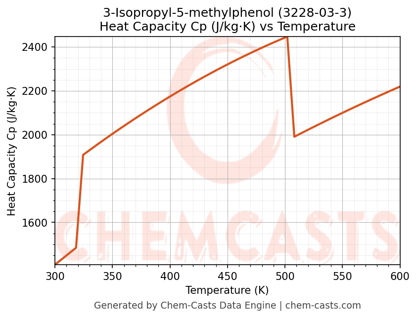 - Specific heat capacity (Cp) indicates the amount of energy required to raise the temperature of 3-Isopropyl-5-methylphenol and is critical for energy balance and heat-exchanger design.