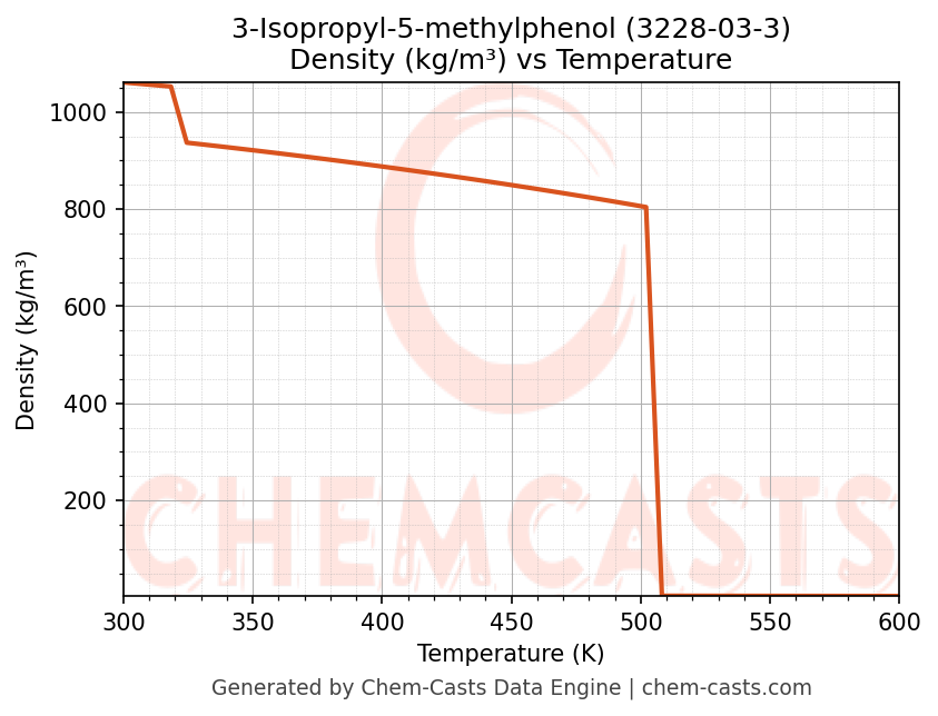 This page presents the temperature-dependent thermodynamic and transport properties of 3-Isopropyl-5-methylphenol (CAS 3228-03-3) calculated at a constant pressure of 1 atm (101325 Pa) over the temperature range 250-500 K.