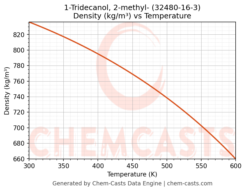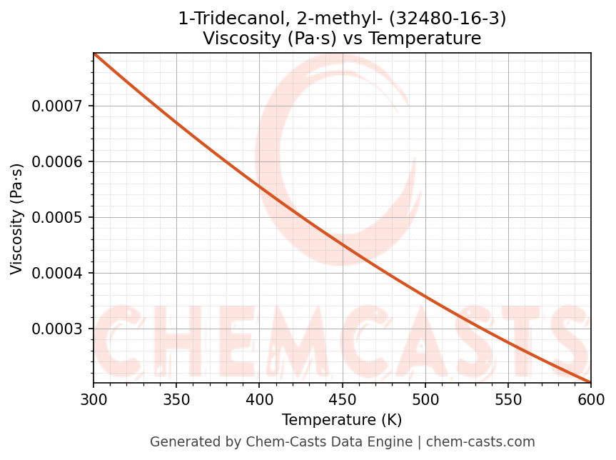 This page presents the temperature-dependent thermodynamic and transport properties of 1-Tridecanol, 2-methyl- (CAS 32480-16-3) calculated at a constant pressure of 1 atm (101325 Pa) over the temperature range 250-500 K.