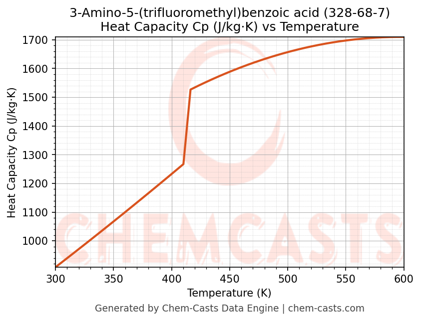 - Specific heat capacity (Cp) indicates the amount of energy required to raise the temperature of 3-Amino-5-(trifluoromethyl)benzoic acid and is critical for energy balance and heat-exchanger design.