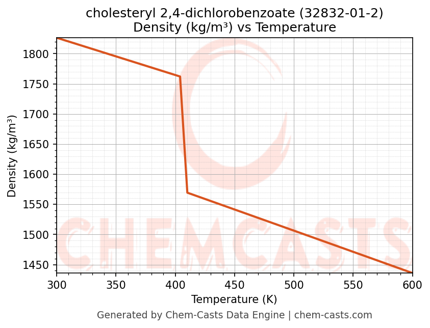 This page presents the temperature-dependent thermodynamic and transport properties of cholesteryl 2,4-dichlorobenzoate (CAS 32832-01-2) calculated at a constant pressure of 1 atm (101325 Pa) over the temperature range 250-500 K.