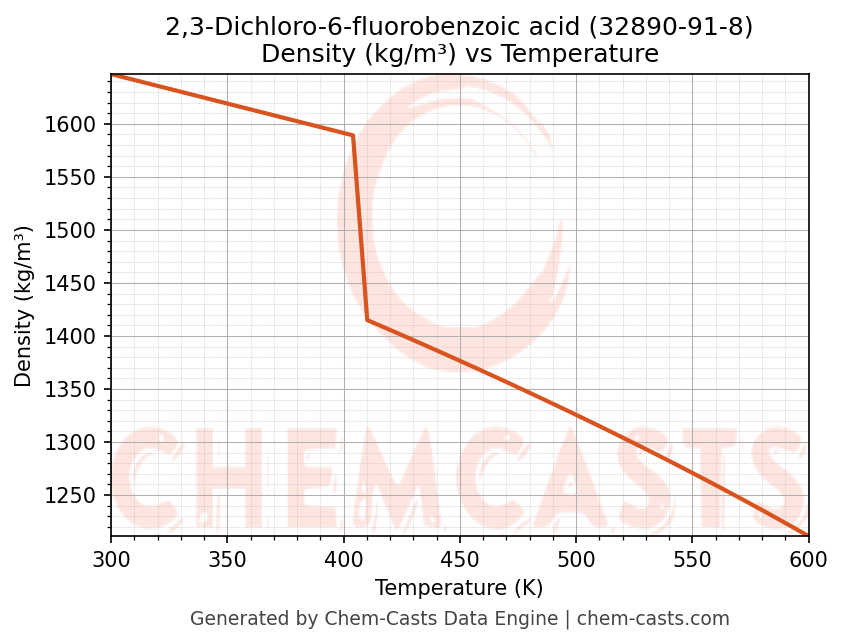 This page presents the temperature-dependent thermodynamic and transport properties of 2,3-Dichloro-6-fluorobenzoic acid (CAS 32890-91-8) calculated at a constant pressure of 1 atm (101325 Pa) over the temperature range 250-500 K.