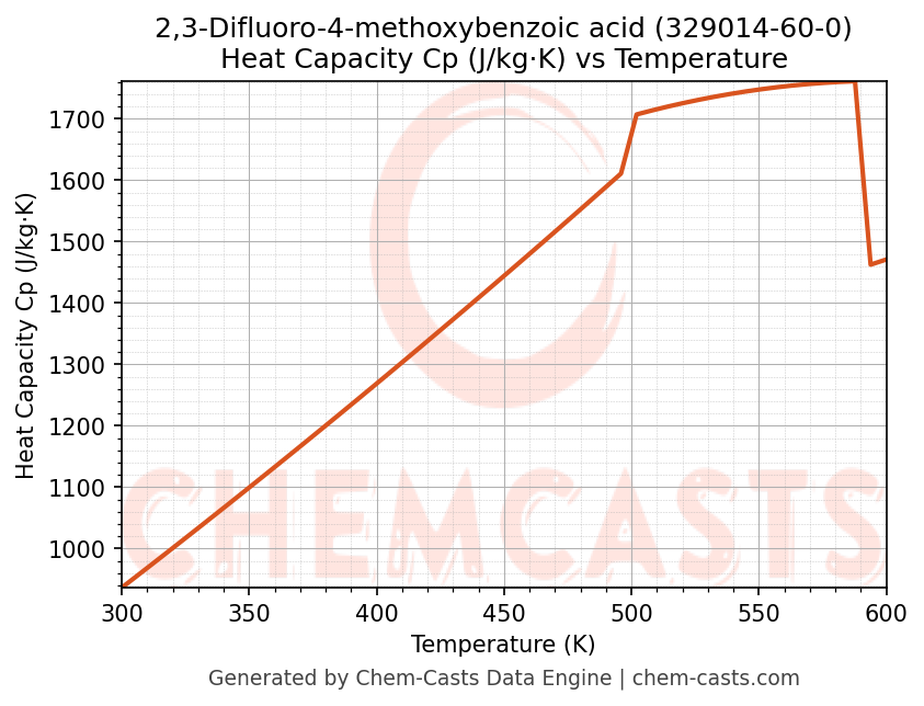 - Specific heat capacity (Cp) indicates the amount of energy required to raise the temperature of 2,3-Difluoro-4-methoxybenzoic acid and is critical for energy balance and heat-exchanger design.