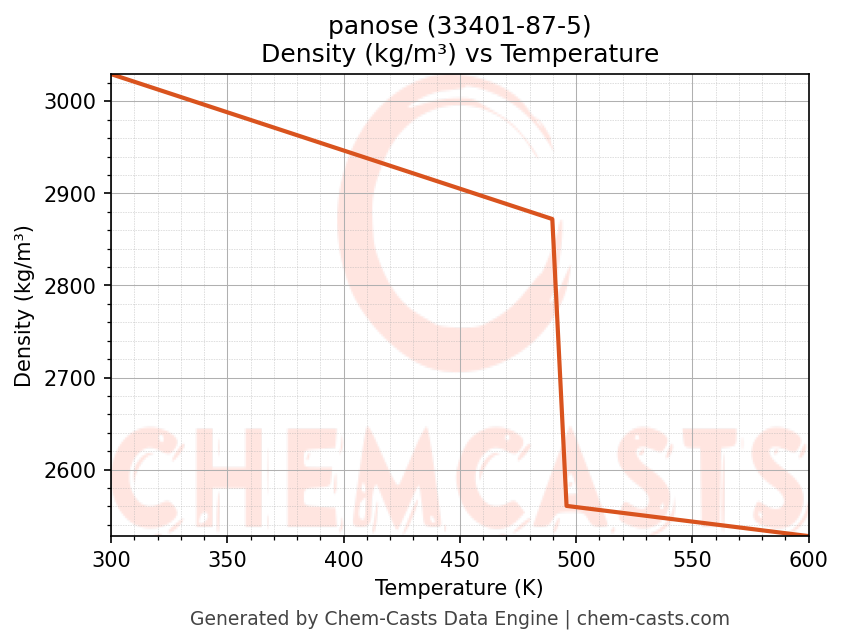 This page presents the temperature-dependent thermodynamic and transport properties of panose (CAS 33401-87-5) calculated at a constant pressure of 1 atm (101325 Pa) over the temperature range 250-500 K.