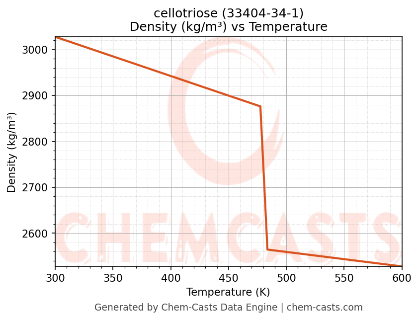 This page presents the temperature-dependent thermodynamic and transport properties of cellotriose (CAS 33404-34-1) calculated at a constant pressure of 1 atm (101325 Pa) over the temperature range 250-500 K.