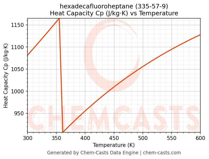 - Specific heat capacity (Cp) indicates the amount of energy required to raise the temperature of hexadecafluoroheptane and is critical for energy balance and heat-exchanger design.