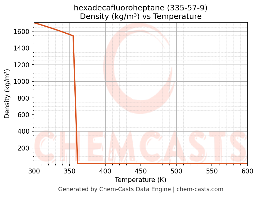 This page presents the temperature-dependent thermodynamic and transport properties of hexadecafluoroheptane (CAS 335-57-9) calculated at a constant pressure of 1 atm (101325 Pa) over the temperature range 250-500 K.