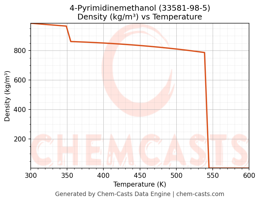 This page presents the temperature-dependent thermodynamic and transport properties of 4-Pyrimidinemethanol (CAS 33581-98-5) calculated at a constant pressure of 1 atm (101325 Pa) over the temperature range 250-500 K.