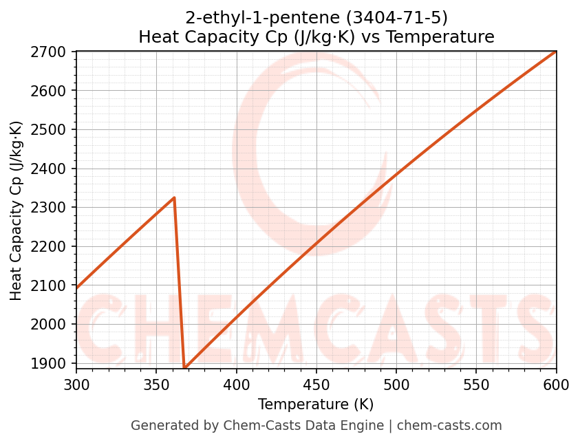 - Specific heat capacity (Cp) indicates the amount of energy required to raise the temperature of 2-ethyl-1-pentene and is critical for energy balance and heat-exchanger design.