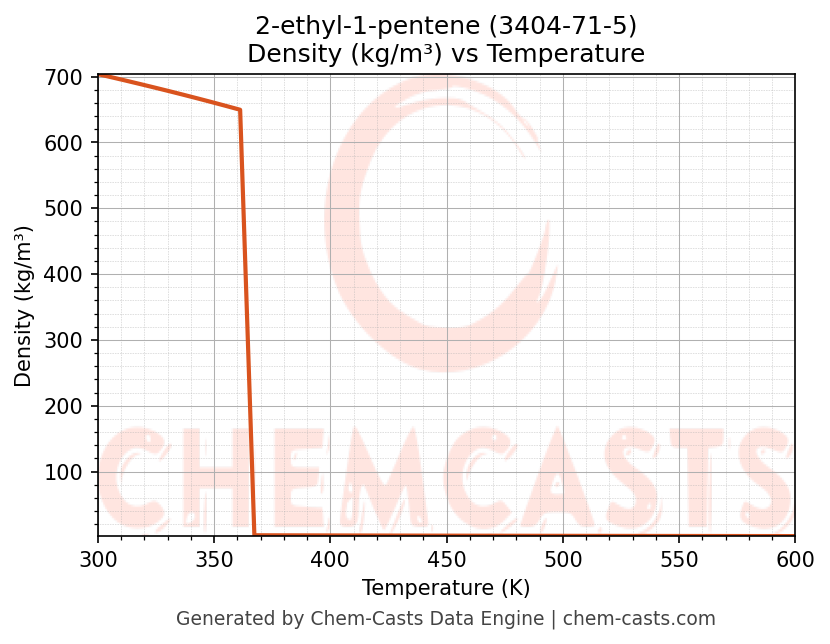 This page presents the temperature-dependent thermodynamic and transport properties of 2-ethyl-1-pentene (CAS 3404-71-5) calculated at a constant pressure of 1 atm (101325 Pa) over the temperature range 250-500 K.