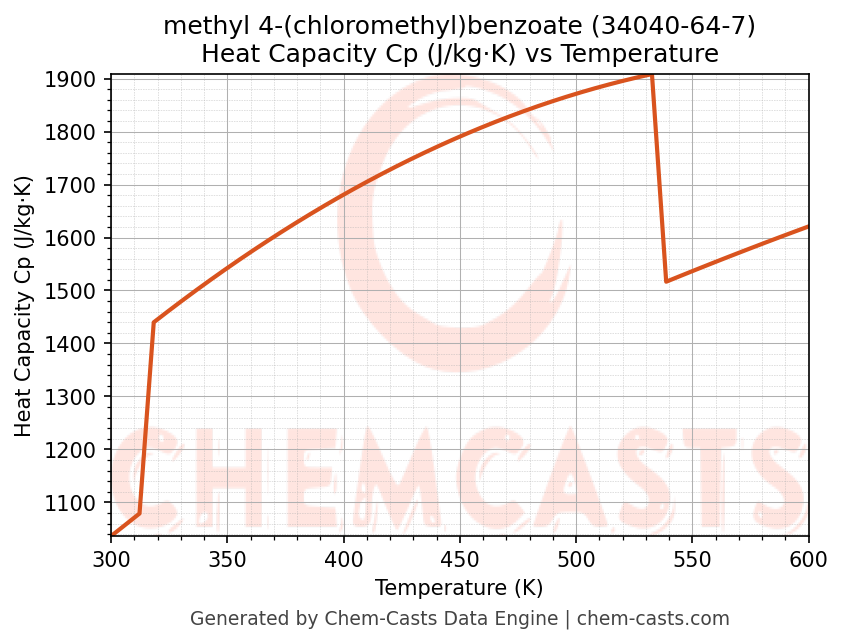 - Specific heat capacity (Cp) indicates the amount of energy required to raise the temperature of methyl 4-(chloromethyl)benzoate and is critical for energy balance and heat-exchanger design.
